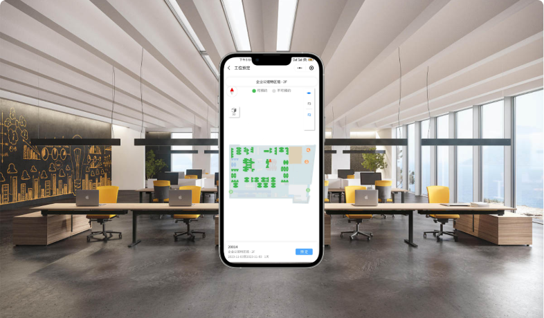 移動端在線預約,選擇可預訂工位進行預約,同步工位地圖,簽到后工位銘牌實況顯示工位信息,指尖預定;
